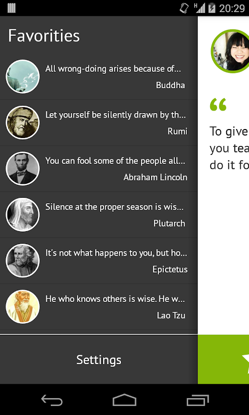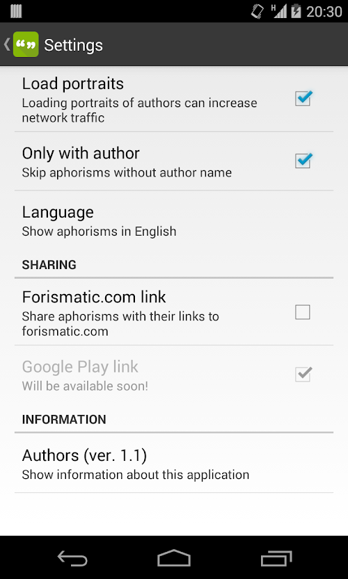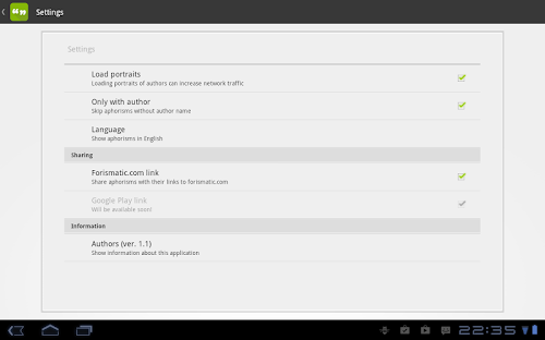 Forismatic Aphorisms — free application that uses the forismatic.com service as a data source. Read the best aphorisms in Russian or English, add your favorite quotations to bookmarks, send it to friends in the social networks! You want to know something about author of aphorism? Take a look at the loaded portrait, and tap for open wikipedia article!