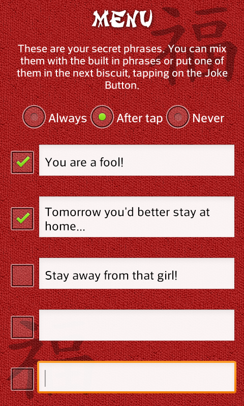 Prank your friends with custom Fortune Cookies messages! Push furtively the hidden button just before your victim breaks his biscuit and make him worry about adverse fortune.