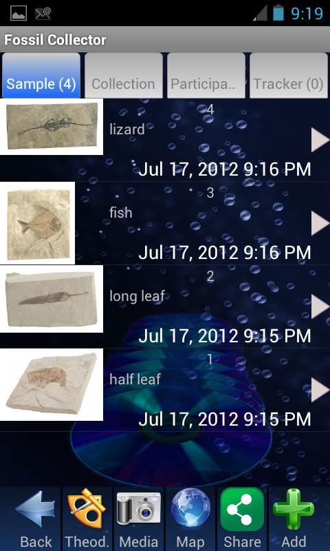 The Fossil Collector allows you to track and document your field work incorporating images, video, audio recordings, and/or text. It also allows you to track (with GPS) your path and enables the data to be synchronized to our website, edit, and/or share your work with others.You can also allow colleagues to view your work during or after your field trip by sharing it through your website, social networks, e-mail, etc. Once the collecting is uploaded to your website, you can edit the data, create reports and/or maps, and download the data or reports to spreadsheets or other documents. (You do not need to have access to the internet to run the application). Give it a try, it is free. Once your collecting is completed, you can automatically create a powerpoint or video of the sampling.