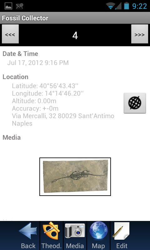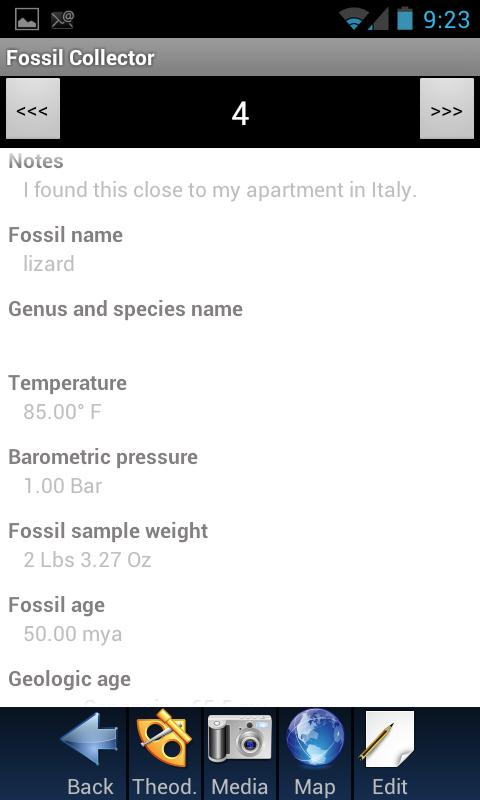 Each event comes with formatted fields to record a description of the event, detailed notes, fossil type, fossil age if known, (or choose the age of the formation from a drop down list of the geologic time scale), sample weight, temperature, and pressure. Specific fields can be hidden and an unlimited number of additional fields can be added.