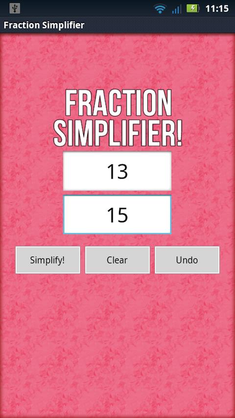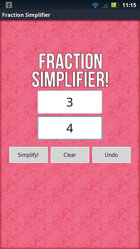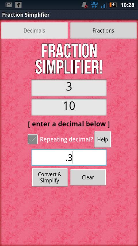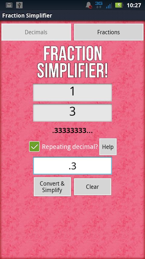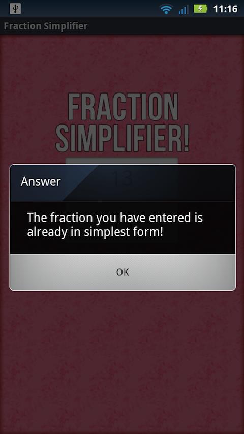 This app will simplify fractions (mixed, proper, & improper) and tell you if the fraction that you entered is already in simplest form. Also, just added, you can enter any decimal and it will automatically convert it into simplest fraction form. It will also convert rational, repeating decimals for you!