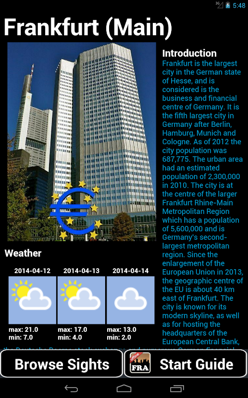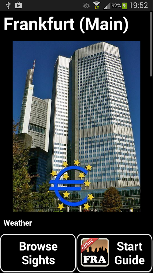 Frankfurt (Germany) Offline Guide is an application that provides Frankfurt city map, subway map, landmarks list, hotel information, phone directory, useful phrases in local language and bars and restaurant information. If you visit Frankfurt or live there, it will be the necessary application.