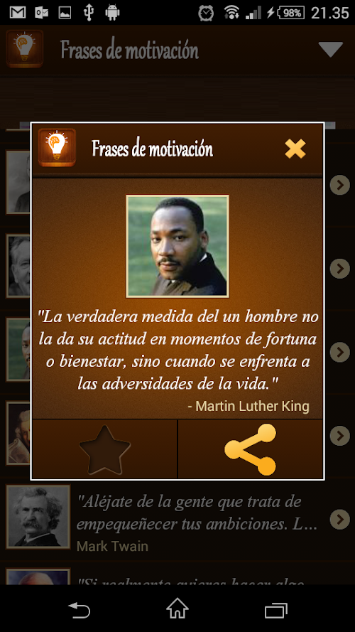 También puedes compartir las frases motivadoras en tus redes sociales para compartirlas con tus amigos.Are there times when you feel discouraged and feel you lack motivation? If this application the motivational phrases ever happened to you is the solution to your problems.