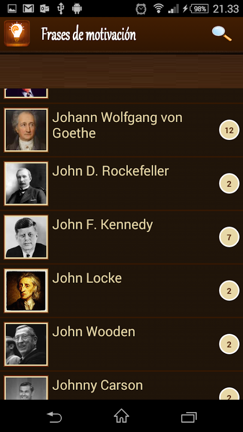 En el apartado "frases" podrás acceder a todas las frases mientras que en "autores" verás cada uno de los autores y podrás entrar a sus frases específicas.