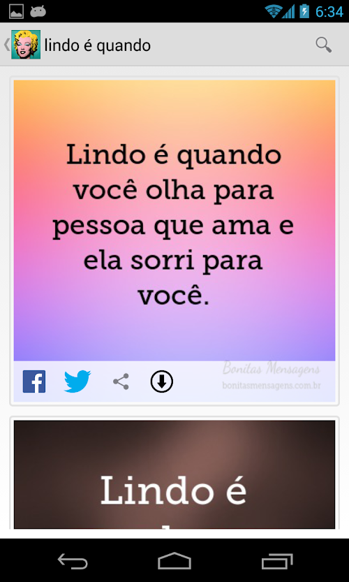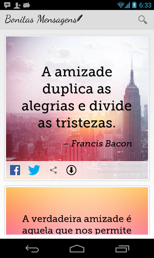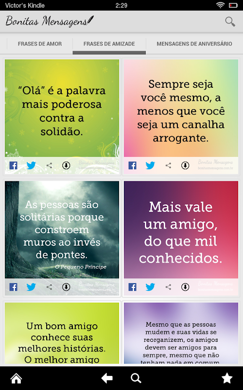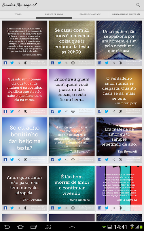 Aplicativo de frases para Android. Lindas mensagens e frases bonitas para todas ocasiões, encontre as melhores frases de amor e amizade, mensagens de aniversário, Deus, Natal, Ano Novo e muito mais. Para enviar por celular sms e whatsapp com imagens para compartilhar no Facebook, Tumblr, Twitter e Instagram.