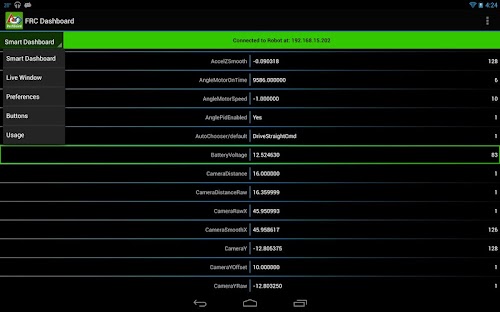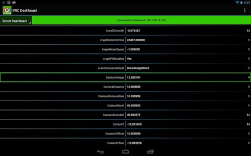 FRC® Dashboard is used as a status dashboard for a FIRST® Robotics Competition (FRC®) Robot. Robot status includes commands running on each sub system (drive, shooter, etc) and component (sensor, state, etc) state. This app also records the values over time. You can also drive the robot from the app.
