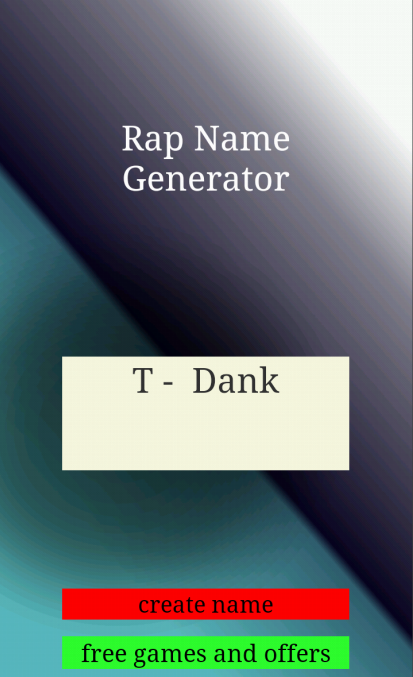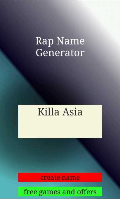 Create your own rap name for free. This rap name generator gives you over 9000 rapper names to generate. With over 9000 names to create you're bound to find your pick. This app has names inspired by hip-hop artists all the way from the West Coast to East Coast. Be the next Jay-Z or Kanye West with this app and create your own killer name.
