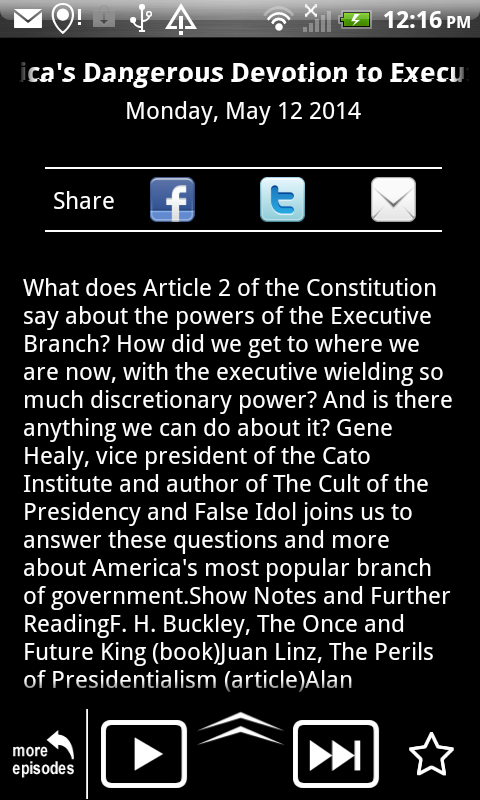 Free Thoughts is a show about libertarianism and the ideas that influence it. Each episode features a discussion with a noted expert or scholar on topics of policy, history, and philosophy. Hosted by Aaron Ross Powell and Trevor Burrus, and produced by Evan Banks. This app is the easiest way to listen to Free Thoughts on your tablet or mobile device.