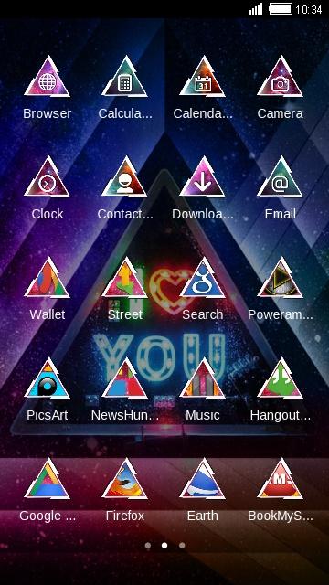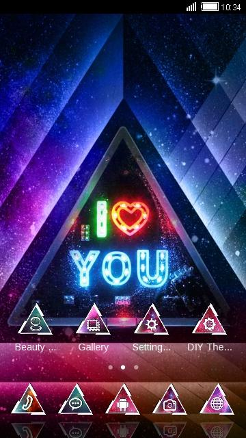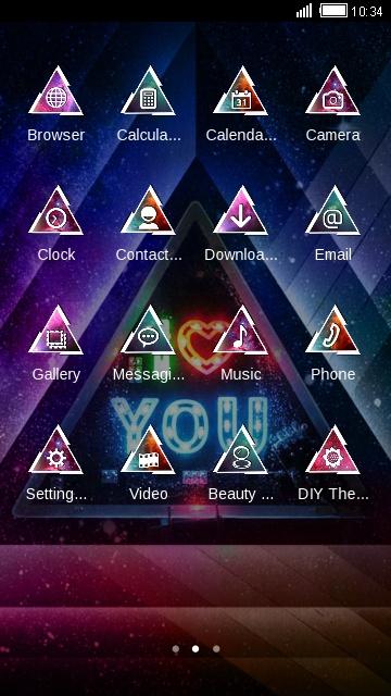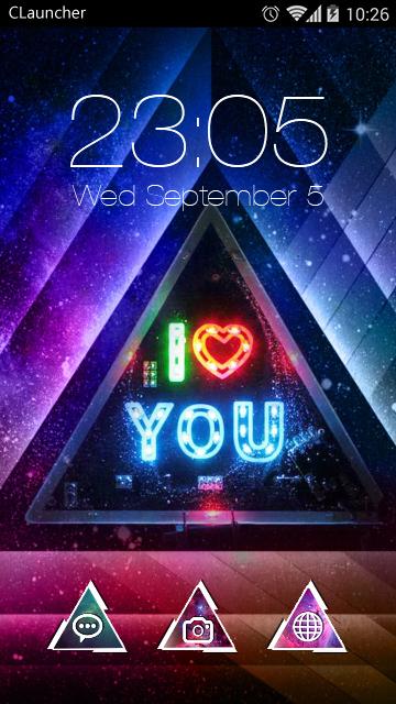 The Hipster Theme gives you a cool and punk look of your Android phone. The wallpaper of this theme is a galaxy triangle which gives you a mysterious feeling. On top of that is a I heart you sign looks like a neon light. The whole tone of this theme is bright. All the frequently used icons are re-designed and fitted into the mysterious galaxy triangle. Outline of the icon is white, so the image is quite obvious and clear. You may find what you are looking for quite easily. This theme is going to help you feel like camping outside the house and looking at the starring sky. Meanwhile, this theme also helps you make a neat and clear look of their phone. Don’t worry about having a normal launcher theme that everyone uses. Choose Hipster Theme and brag about it to all your friends. This theme will definitely show your taste and your style. You can also share this with your friends, then you guys could use the same cute theme at the same time. How cool is this! Come and experience this Hipster Theme designed for Clauncher!