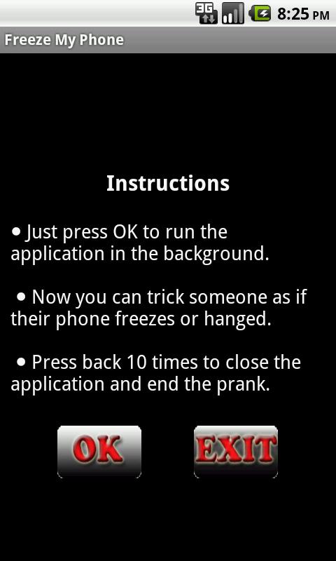 Let your friend, family or even your enemy experienced this great prank by tricking and scare them with your phone not responding to your touch. Freeze My Phone is a simple prank app which runs in the background and disable your some of your button, until the prank is finished. Download it now and let them panic!