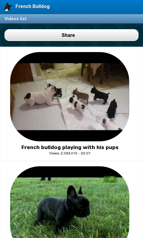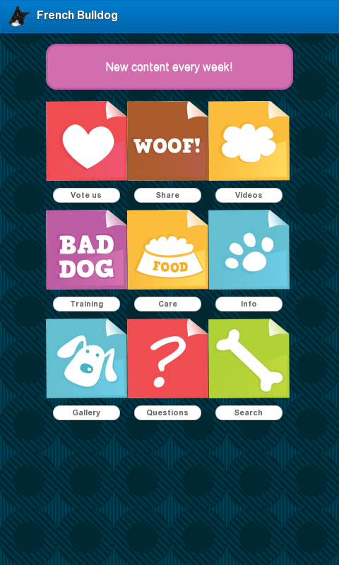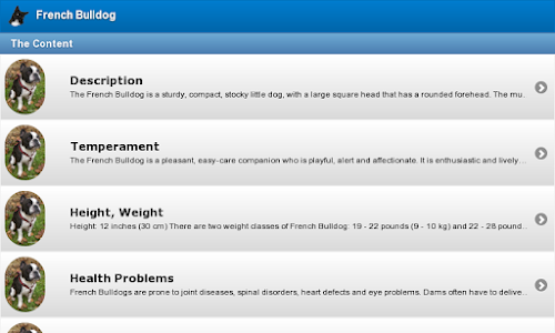 French Bulldog Dogs, app for Android. If you own a French Bulldog, or you want to buy a dog soon, this application is for you. Are you a dob breeds fan? Have all the info about your dog breed in your mobile phone or tablet. Includes dozens of dog pictures and photos, information about your dog, training exercises and more. Detailed contents: