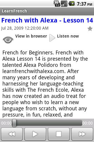 Learn French with Podcasts is designed to help you learn French the most natural, effective, and effortless way. It integrates over 20 carefully selected popular podcasts that cover almost every aspect of the French language. With Learn French with Podcasts you can: