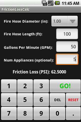 A handy tool for firefighters! Calculate friction loss based on hose diameter, hose length, gallons per minute, and optionally, number of appliances (approximated at 5psi/appliance).