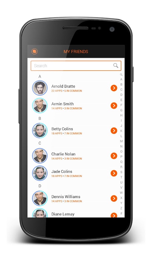 Friends App for Android is totally automated and requires minimum intervention from you. The app automagically finds, sorts and categorises your Android app and let's you select just the apps you want to be visible to your friends. Find friends app easily with Friends App!