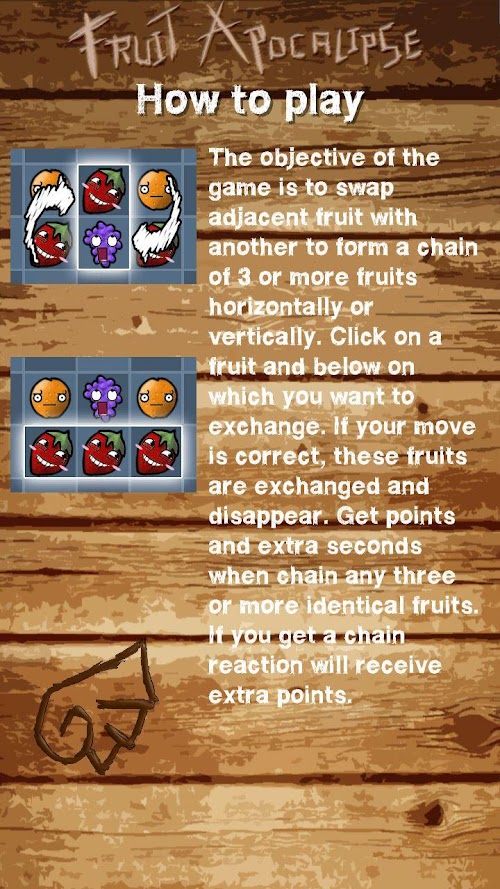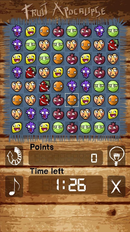 Beat your own score in a against the clock mode joining three or more of the disposible funny fruits also for each combination you can add some seconds to your time.