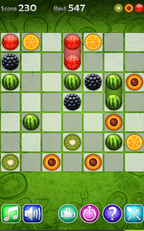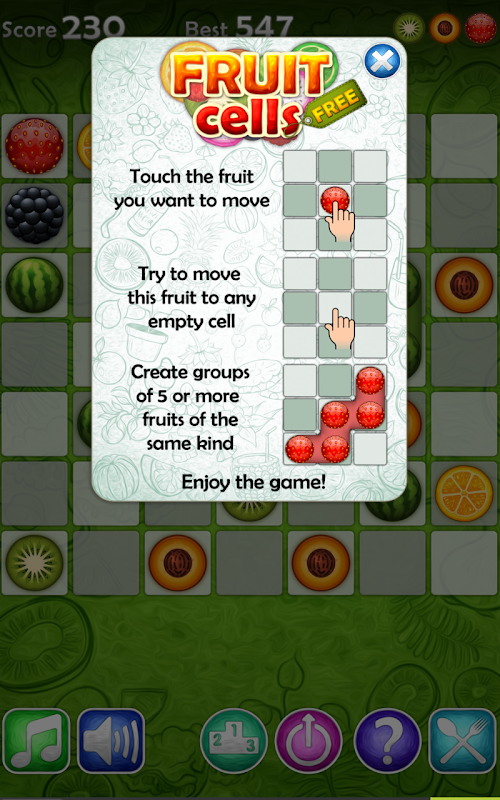 Fruit Cells Free is a very enjoyable colorful puzzle game. Once you start, you won’t want to stop. Try it, and see how high you can score. The goal is to group five or more fruits of the same kind together. Once the fruits are grouped, your score increases, and the grouped fruits disappear to make room for more maneuvers. After each turn, more fruits appear on the board and your task becomes more difficult. The game is over when the board completely fills up. Enjoy the game!