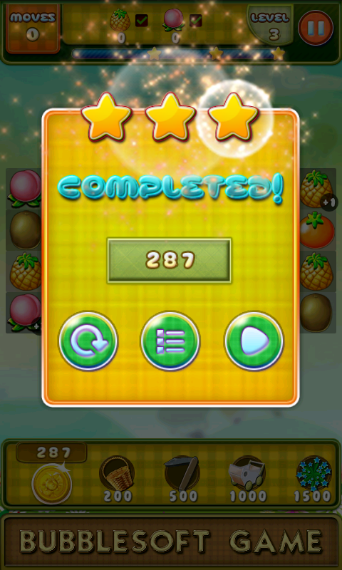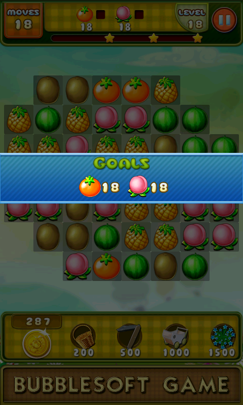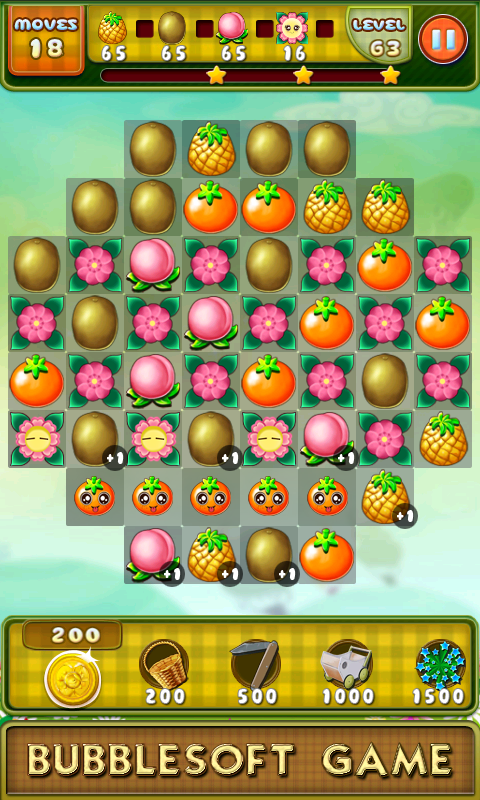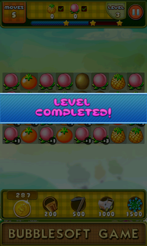 1.Switch the adjacent fruits,Make 3 or more with the same type together to eliminate them.Collect cute crops mixed with fruits and flowers showed on the top to win the levels before you run out of moves.