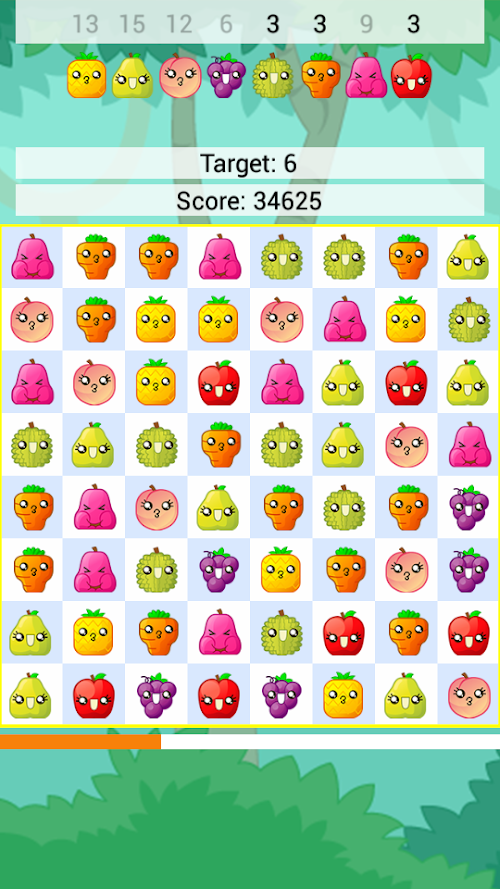 Clear three or more same fruits to score points and complete the quest for each level.