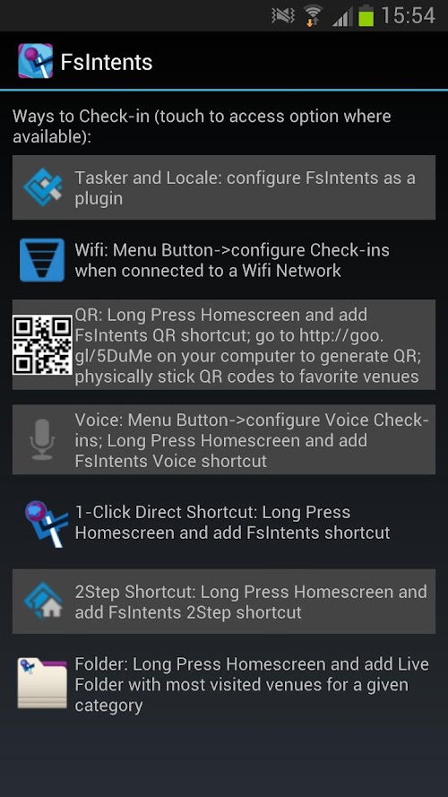 Wifi is available just about everywhere nowadays. FsIntents will use that to automatically check you in. It's also a Tasker and Locale plugin or a 1-touch simple-as-it-gets shortcut solution for all your automatic check-in needs. You can also check-in using the 2-step process, Live Folders, QR-Codes and Voice commands. Read about all these methods below. Don't forget to change FsIntents' settings to suit your needs!