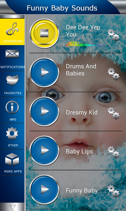 This cool soundboard will help you to grab your babies attention, and calm them for few hours. Everyone enjoy in funny baby music, why not to use this great app to make funny jokes to your kids, too. Baby talk, babies laugh, babies crying and many other ringtones are implemented into this app. Everything with children is cute and funny, and life with kids is amazing, so with this baby app we guarantee you will have one more reason to be happy and positive. Enjoy with your family by playing funny baby noise and beautiful baby singing, we offered in this new baby app. Enrich your android phone much more, and get best humor and amazing sounds. You and everybody around will fill happiness after long laughter, so download best funny baby sounds for free and enjoy your time. Indian kid, remix baby, baby chicken, chinese baby and many other sounds you can find in this funny app.