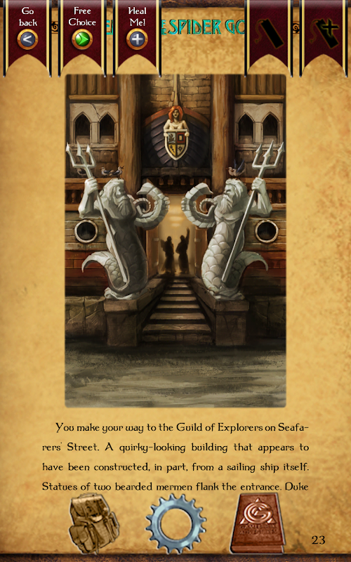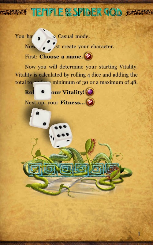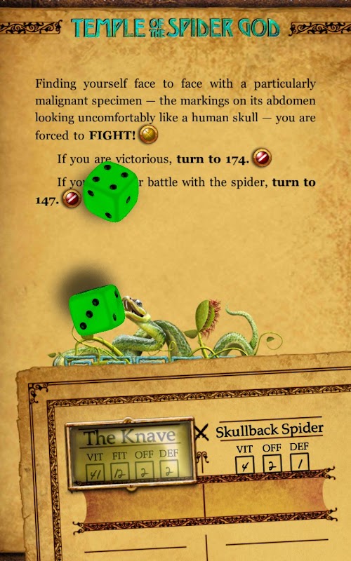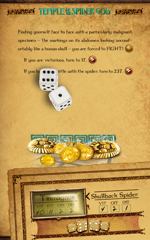 Occasionally you will be presented with a situation that needs to be resolved with some dice rolling. The gamebook engine lets you throw 3D physics based dice that roll and bounce as if you were tossing them on a tabletop. Roll the dice to resolve combat by pitting your character against a myriad of enemies. Roll the dice to see if you were able to leap the gaping chasm, or pick the shopkeep’s pockets. Roll the dice to see if you won a bet, or caught the plague!