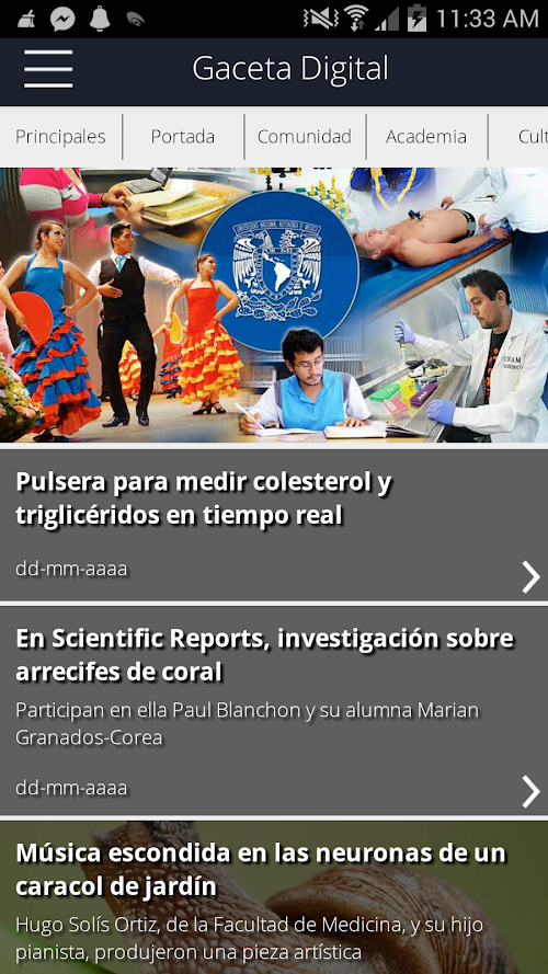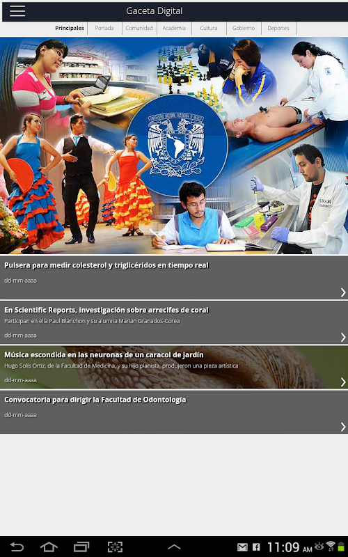 A través de la aplicación de Gaceta Digital UNAM, la Universidad Nacional da mayor difusión a su quehacer académico, científico, tecnológico, cultural, deportivo y administrativo que dos veces por semana publica Gaceta UNAM en su versión impresa. Ahora todos los lunes y jueves la comunidad universitaria y el público en general podrán tener acceso a su contenido de manera más fácil y rápida por medio de sus dispositivos móviles.Through the implementation of Digital Gaceta UNAM, the National University give more publicity to his academic work, scientific, technological, cultural, sporting and administrative twice weekly UNAM Gazette publishes in print. Now every Monday and Thursday the university community and the general public may access their content more easily and quickly through their mobile devices.