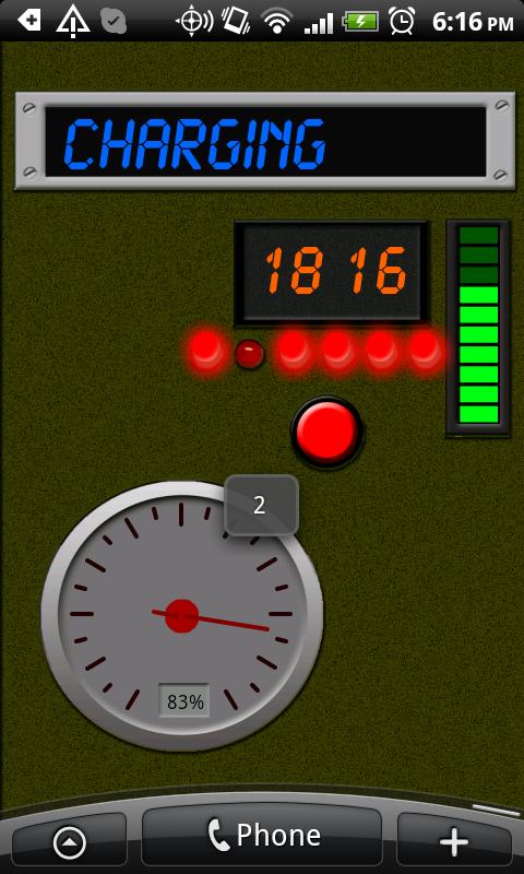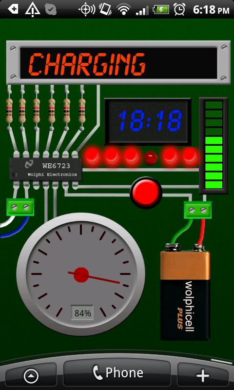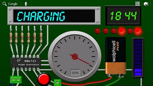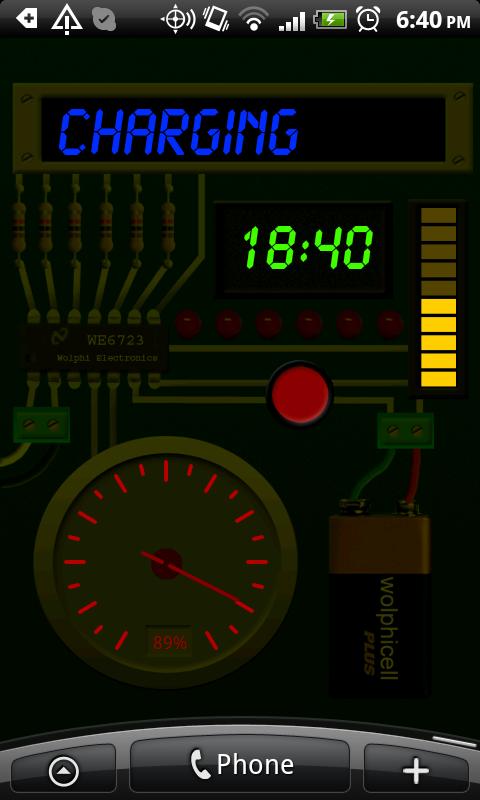Gadget Battery Wallpaper is a colorful and fancy circuitry live wallpaper for gadget fans. It looks like a simulator and shows an electronics board with 2 LED displays. One LED display shows the battery status, the other one the time. 5 LED's below the time display will show the seconds in binary format. A meter and a LED bar show’s also the level of the battery. The colors of LED display and LED bar are adjustable but sliding by touching the LED display, LED bar or the meter.