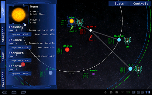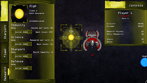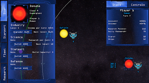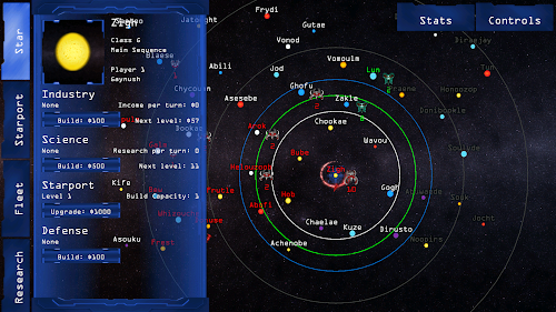 In Galaxy War you build various types of space stations around stars. Star class and size impact the resources levels and max station build levels for each species and type of space station differently. Resource stations earn income needed to support advanced spaceship construction and extend your empire across the galaxy. Science research stations research technology advances needed to maintain technical superiority over the enemy. Defense stations can be effective for defense of your space colony from an invading alien civilization. With no ally at your side, enemies are everywhere. Starports are required to build spaceships. Each species can construct four different spaceship classes: frigate, cruiser, battleship, and capital ship. Each spaceship class is progressively more expensive and powerful, requiring substantial resources and colony infrastructure to build.