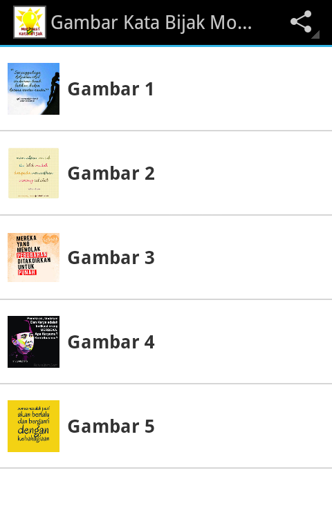 Gambar Kata Bijak Motivasi adalah aplikasi android yang berisi kumpulan gambar kata bijak dan motivasi populer, termasuk dari motivator Mario Teguh dan Andrie Wongso. Anda dapat menjadikan gambar tersebut sebagai wallpaper, gambar profile DP BBM, atau di-share ke teman-teman Anda melalui BBM, Whatsapp, Twitter, Facebook, Line dan media sosial lainnya.