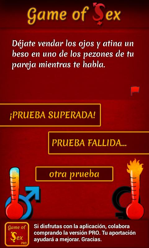 --- Durante el juego te enfrentarás a pruebas (a veces con tiempo), si las superas ganarás un premio y si fallas recibirás un castigo por parte de tu pareja. En cualquiera de las 3 situaciones sino estás cómodo/a con la prueba/premio/castigo indicada, no te preocupes, pulsa un botón y obtendrás otra, ¡continúa la diversión!!