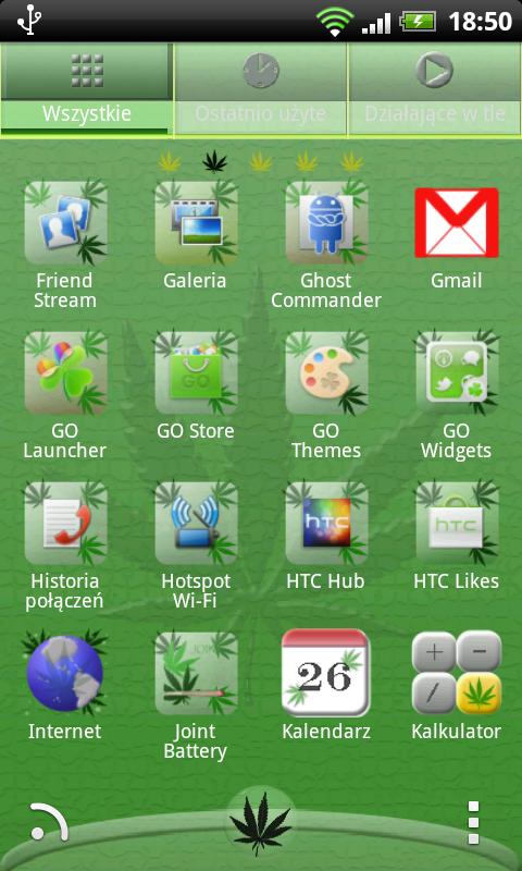 On the wallpaper is the big green leaf of the marijuana. Theme is in the real rasta colors: green, yellow and red. Launcher is sunny and bright like Jamaica so theme can make you happy. Weed usually relaxes you and makes you cheerful, blissful and contented. Icons are covered with leaves.
