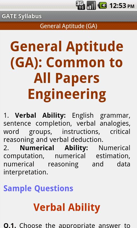 “GATE 2014” android application contains the complete syllabus copy of GATE (Graduate Aptitude Test in Engineering) 2013 exam.