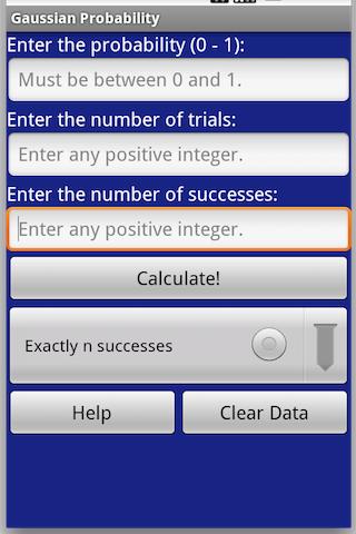 Solves basic Gaussian probability problems! For example, "What is the probability of getting at least 5 heads out of 9 flips?" or "What is the probability of rolling a 2, exactly 10 times out of 15?" You see these types of problems in algebra courses.