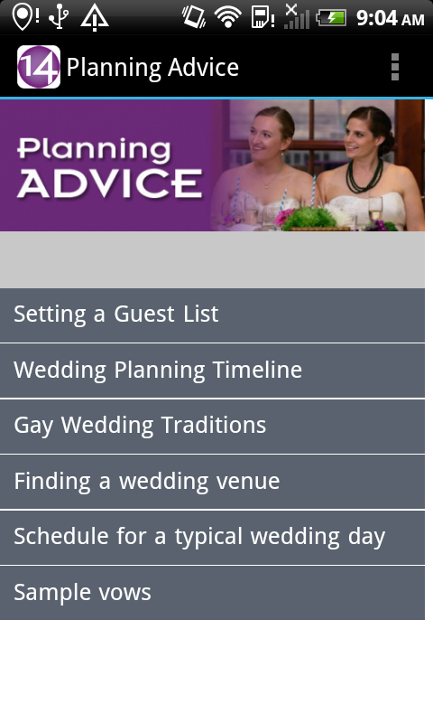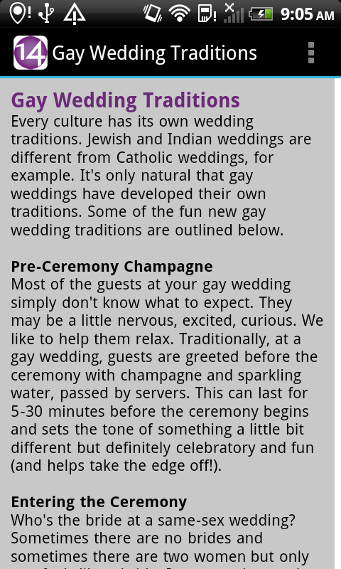 Welcome to the official mobile app for Gay Wedding Confidential. This app contains all the information you need to know about planning your gay wedding, including some neat interactive features!