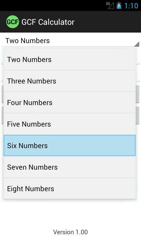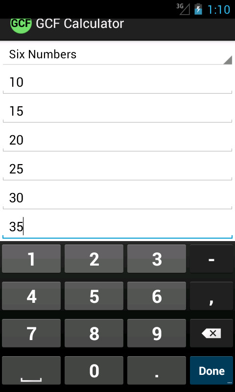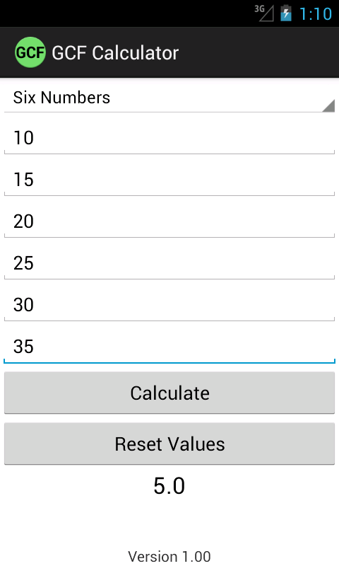 A simple greatest common factor (GCF) calculator. Just input up to eight numbers and this app will calculate the GCF of those numbers.