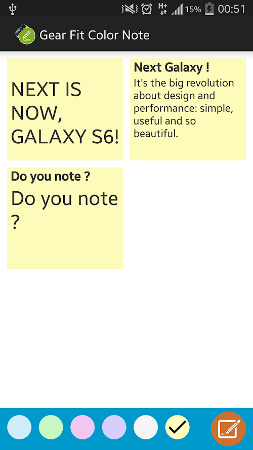 Gear Fit Color Note: A simple note will help you manage your schedules and notes right on Gear Fit. When you write notes, memos, to-do list or shopping lists... Gear Fit Color Note will gives you a quick and easy note editing experience.