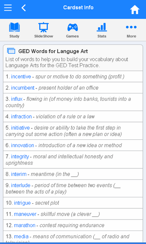 GED Flashcards app includes 3100 premade flashcards from 4 categories which cover all aspects of the General Equivalency/ Education Diploma Test exam: