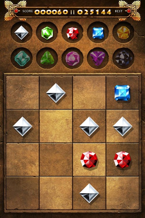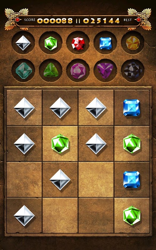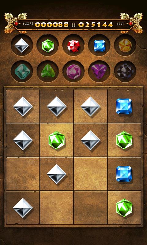 Pair gems, slide one on the other to join to create a new kind of gem. Two silver ones create one green, two green ones create one red and so on. This order is shown on the top of the screen. Try to get the most precious one - the Black Gem. Good Luck.