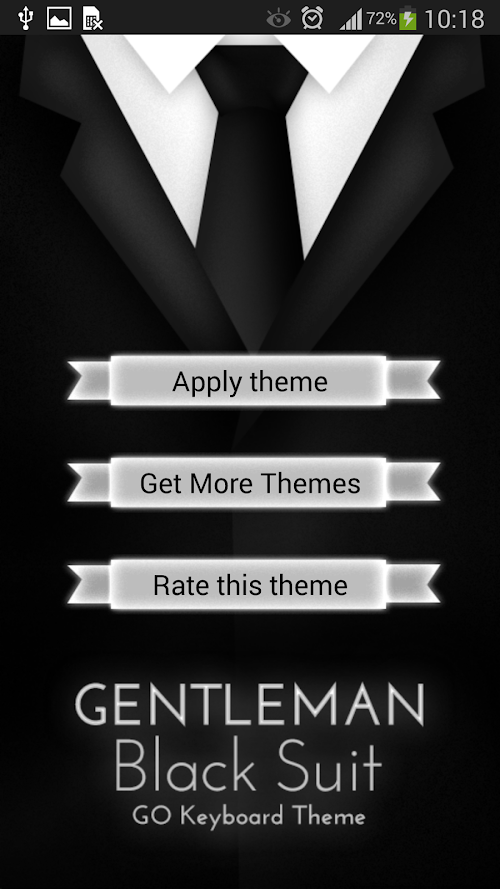 "Gentleman Black Suit Keyboard" is a GO keyboard theme designed by Inner Works Studios for all hipsters who love to dress classy and elegant. The theme features glowing white transparent buttons and a elegant white font on a classic black suit and tie. Dress up in fancy black and white your smartphone with this stylish premium theme! We hope you enjoy Gentleman Black Suit Keyboard theme!