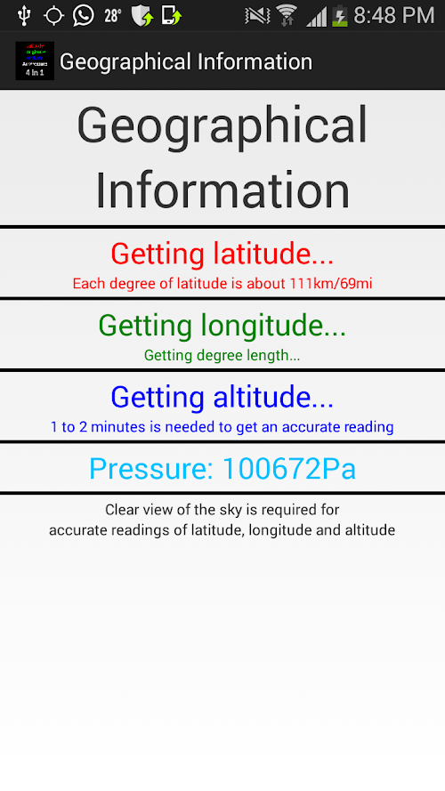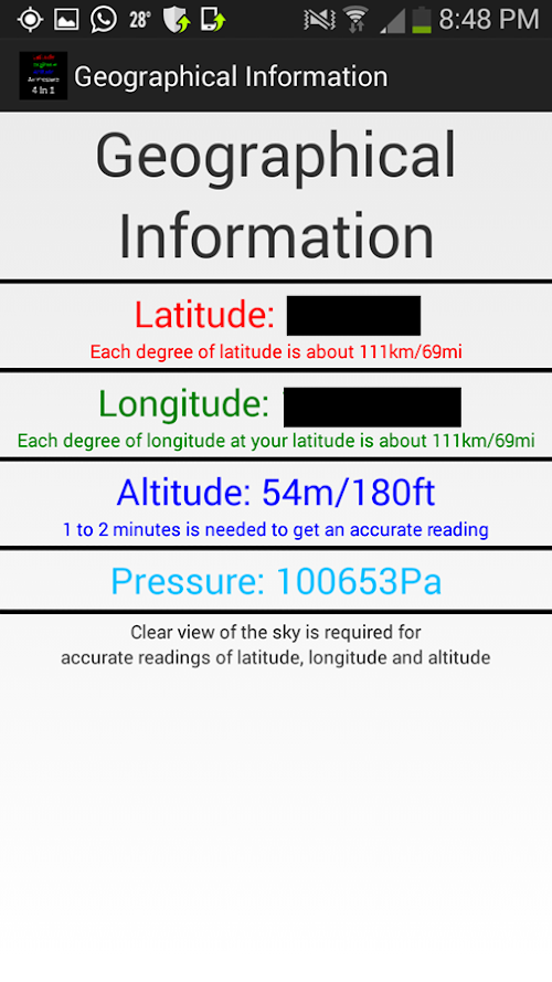 Tells the latitude, longitude, altitude and air pressure accurately. The accuracy of the values varies with your phone. Some phones might not have the ability to get air pressure.