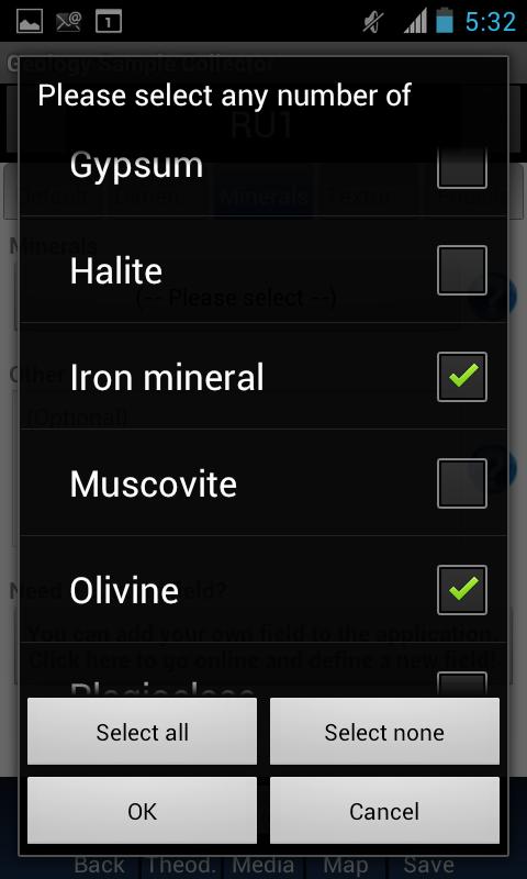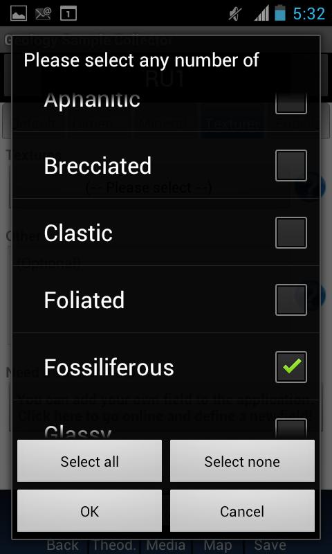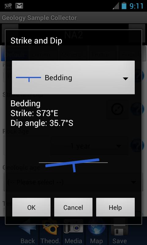 Each event comes with formatted fields to record a description of the event, detailed notes, rock type, rock age if known, (or choose the age of the formation from a drop down list of the geologic time scale), sample weight, temperature, and pressure. Specific fields can be hidden and an unlimited number of additional fields can be added.