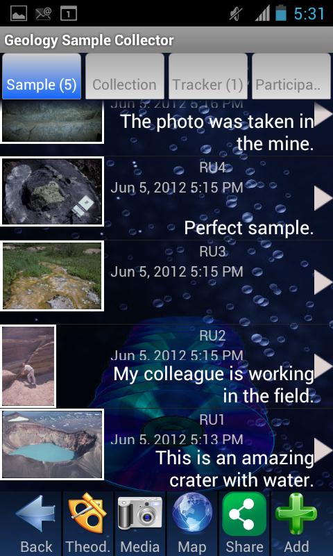 The Geology Sample Collector allows you to track and document your field work incorporating images, video, audio recordings, and/or text. It also allows you to track (with GPS) your path and enables the data to be synchronized to our website, edit, and/or share your work with others.You can also allow colleagues to view your work during or after your field trip by sharing it through your website, social networks, e-mail, etc. Once the collecting is uploaded to your website, you can edit the data, create reports and/or maps, and download the data or reports to spreadsheets or other documents. (You do not need to have access to the internet to run the application). Give it a try, it is free. Once your collecting is completed, you can automatically create a powerpoint or video of the sampling.