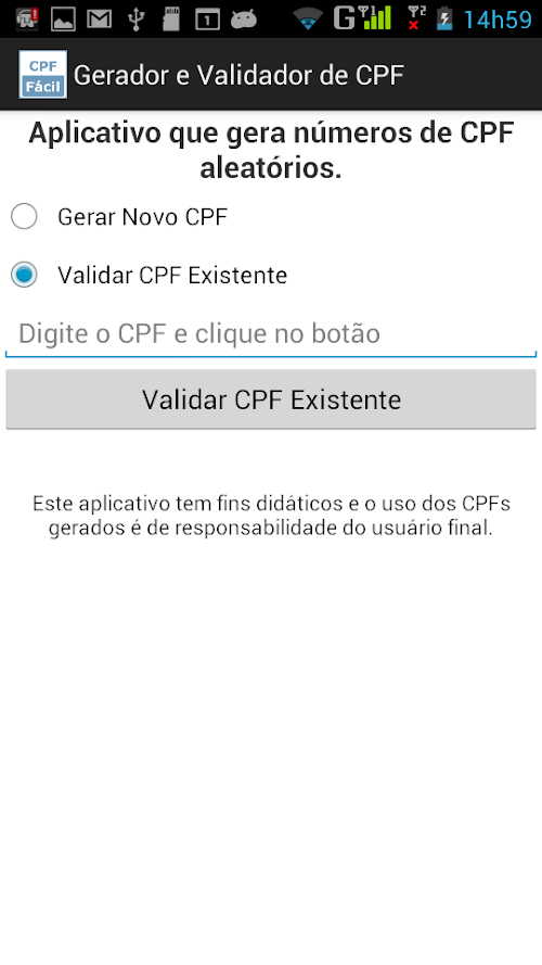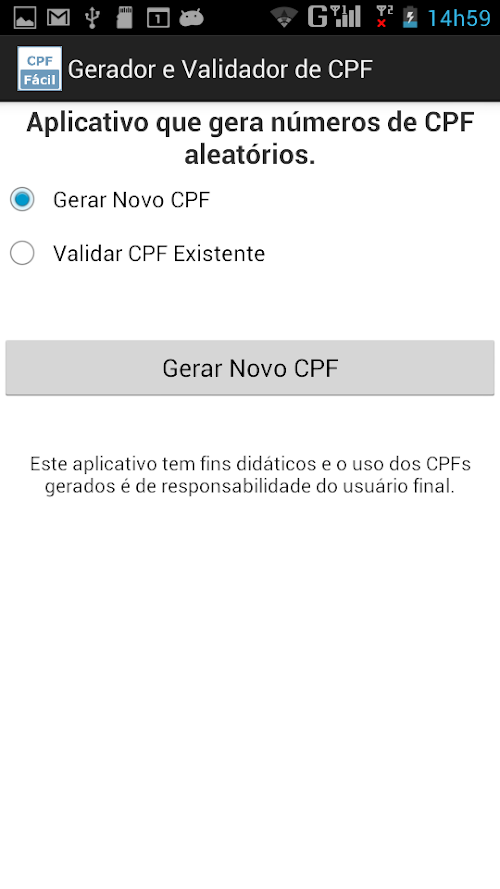 Lembrete: Esse aplicativo tens fins didáticos e o uso dos numeros de CPF gerados é de responsabilidade do usuário final;