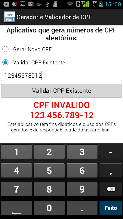 Reminder: This application have teaching purposes and the use of CPF numbers generated is the responsibility of the end user;