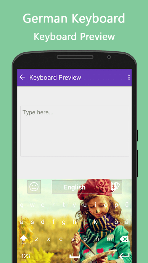 German keyboard app will allows you to type message, Story, E-mails etc. in German language. You will find superb eye catching themes from German Keyboard. You can set your own photo in keyboard and make it cute. German Keyboard app will also provide custom settings. Of course you want such lovely and cute Emoji, so it is also there.