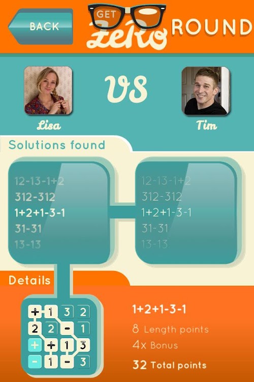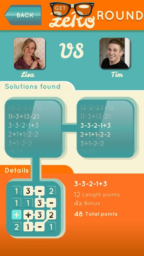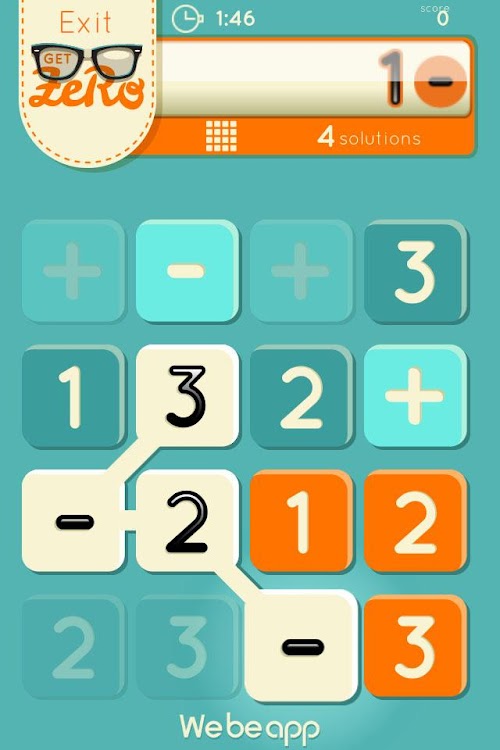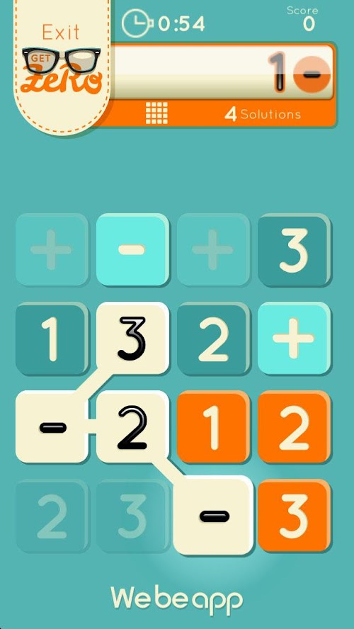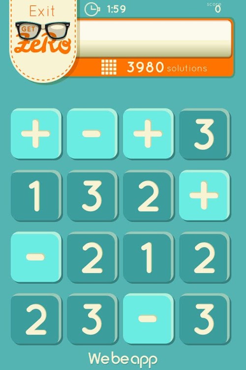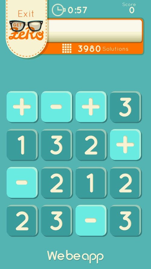 Playing with Get Zero is very easy: in each round you have a board with 16 buttons. The aim is finding as many zero-resulting expressions as you can within 2 minutes. Every match has 3 rounds, and the winner is the player who gets the highest score.