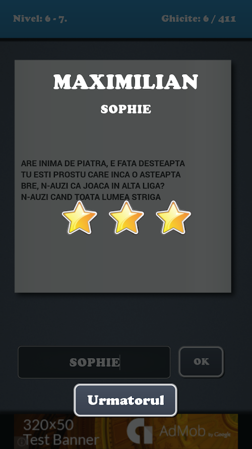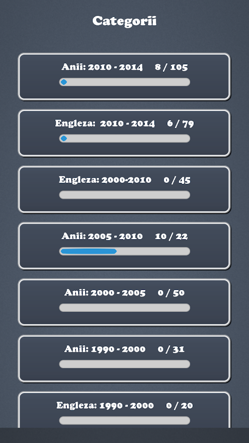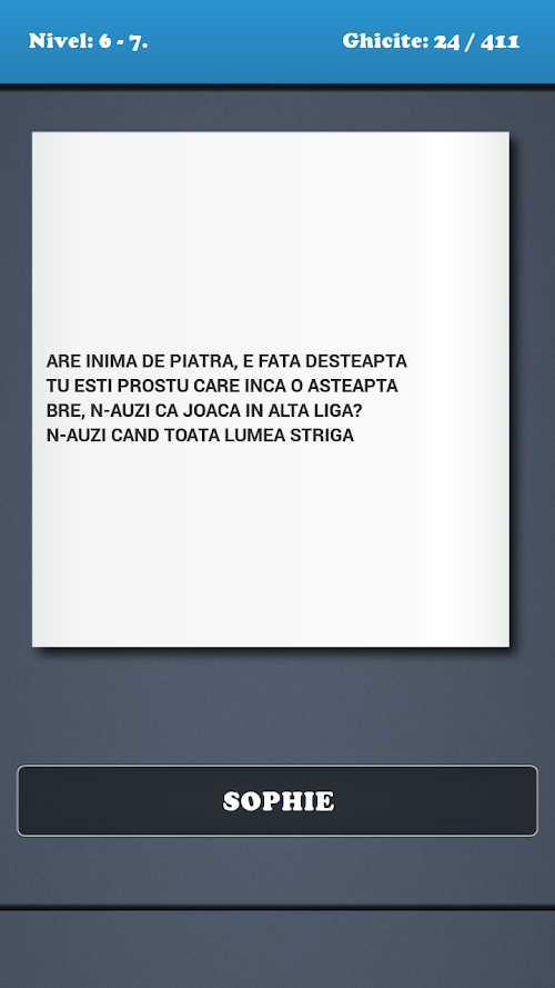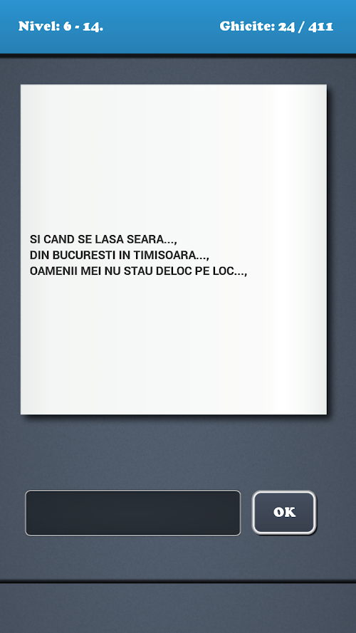 * in urmatorul update vom adauga la categorii genuri muzicale (romantice, pop, hip-hop etc)"Guess the song" you to test the ability to recognize different songs based on some simple lyrics. The songs are divided into categories.