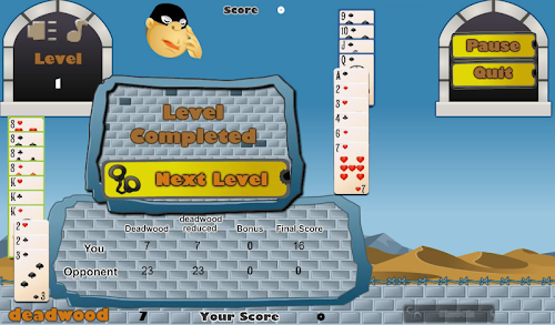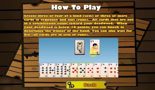 Play a classic Gin Rummy card game against a computer opponent. Be the first to get 100 points and win. The object of the game is to collect a hand where most or all of the cards can be combined into sets and runs and the point value of the remaining unmatched cards is low. Create three or four of a kind (sets) or three or more cards in sequence and suit (runs). All cards that are not in a combination count toward your deadwood. When your deadwood is 10 points or less, you can knock to determine the winner of the hand. You can also wait for Gin (all cards are in sets or runs).