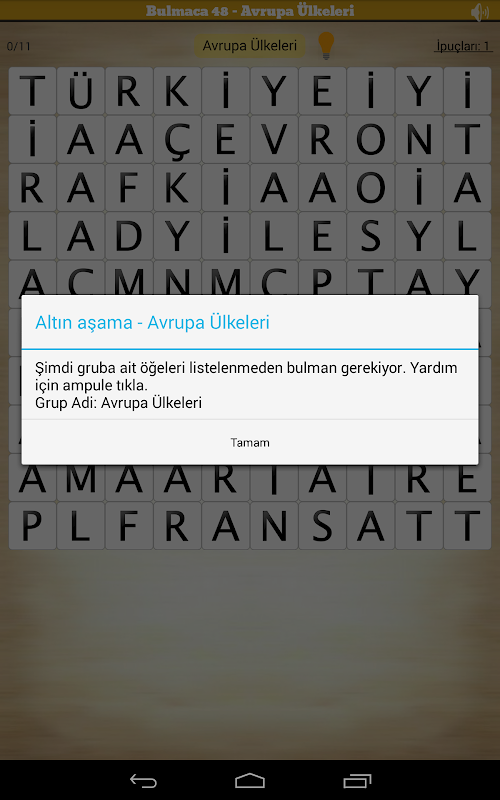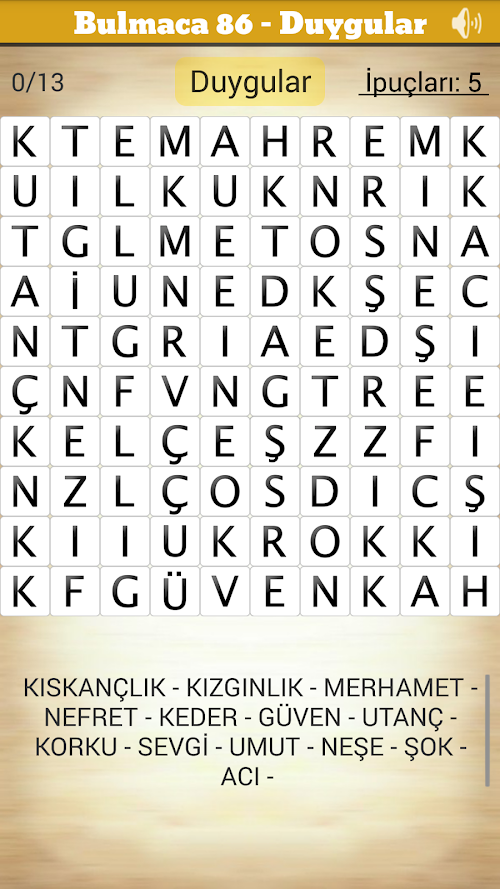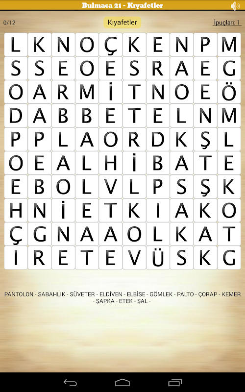 Bir dokunuşla kelime arama: belirli bir kategorideki tüm kelimeleri bul, sonrasında verilen ipucunu kullanarak Gizli Kelimeyi ortaya çıkart.