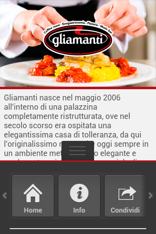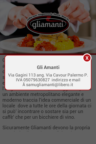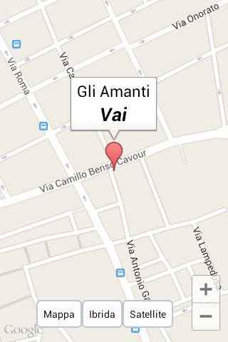 Gli amanti nasce nel maggio 2006 all’ interno di una palazzina completamente ristrutturata, ove nel secolo scorso ospitava una elegantissima casa di tolleranza, da qui l’ originalissimo nome, che oggi sempre in un ambiente elegante metropolitano e moderno traccia l’ idea commerciale di un locale dove a tutte le ore della giornata ci si può' incontrare come sostare sia per un caffè' che per un bicchiere di vino. In egual misura si possono scegliere i piatti a base pesce che quelli a base di carne Scaricando l' app potrai usufruire del programma di fidelizzazione che riserviamo ai nostri clienti particolariLovers was founded in May 2006 to 'inside of a building completely restored, where in the last century was home to a very elegant house of tolerance, hence the' original name, which is now forever in an elegant and modern metropolitan track 's idea of a commercial room where at all hours of the day you can 'meet as both stand for a coffee' you for a glass of wine. Equally you can choose the dishes that those fish meat downloading the 'app can take advantage of the loyalty program that is reserved for our special customers